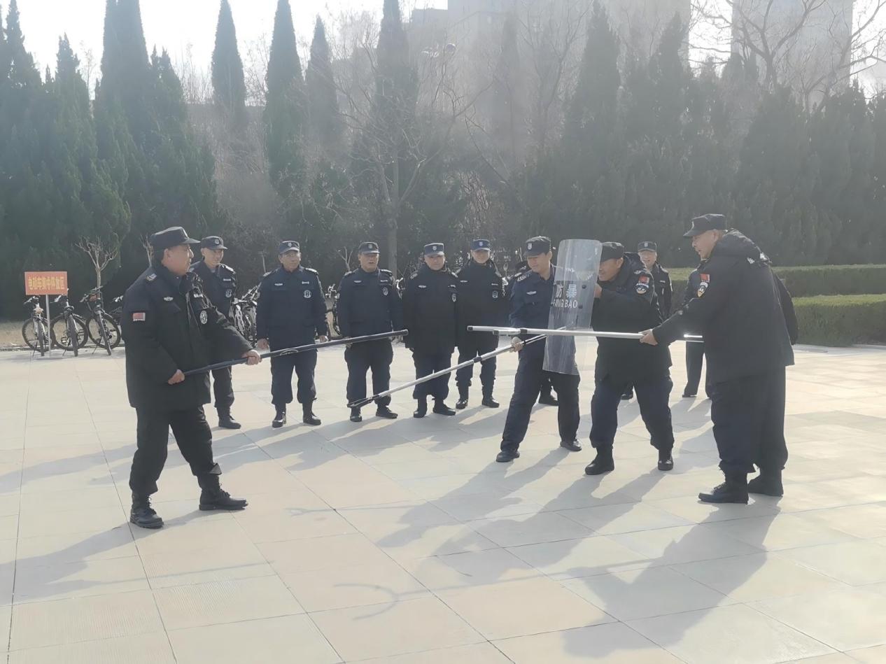 在防暴器材使用培训环节,工作人员详细讲解防暴盾牌、防暴钢叉、橡胶棍等器材的功能与使用规范,演示盾牌防御、钢叉制敌、多人协同配合等实战动作,提升安保人员应对突发事件的快速响应与协同处置能力。